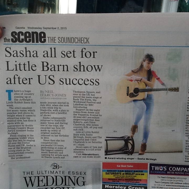 Sasha McVeigh | Alan West w Steve Black| Chloe Chadwick |Little Rabbit Barn |Saturday 5th September 2015